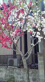 一本の木に、真っ白とピンクと真っ赤の花が咲いてて。